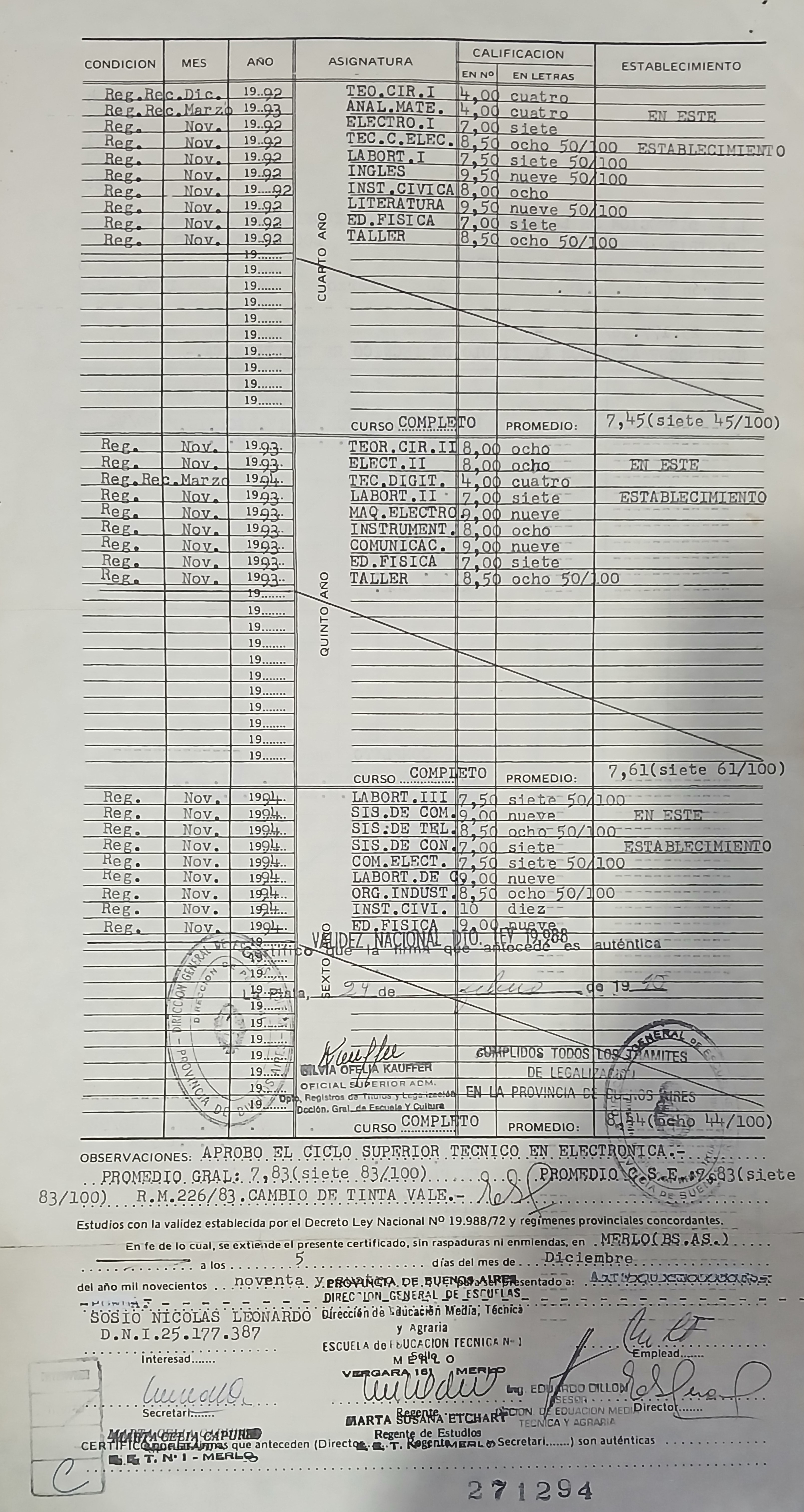 Técnico Profesional en Electrónica con plena potestad bajo la Ley Nacional 19.988 y la Resolución R.M. 226/83